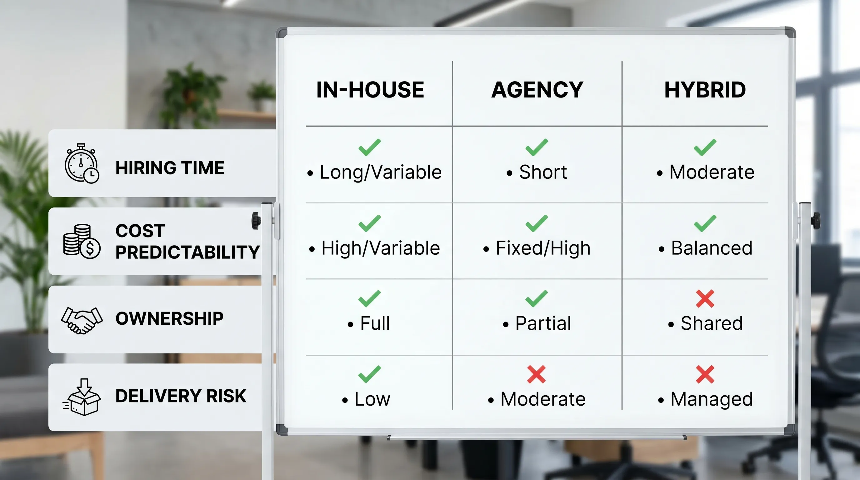 | Cost predictability | Medium (hiring surprises) | Higher (defined scope and milestones) |