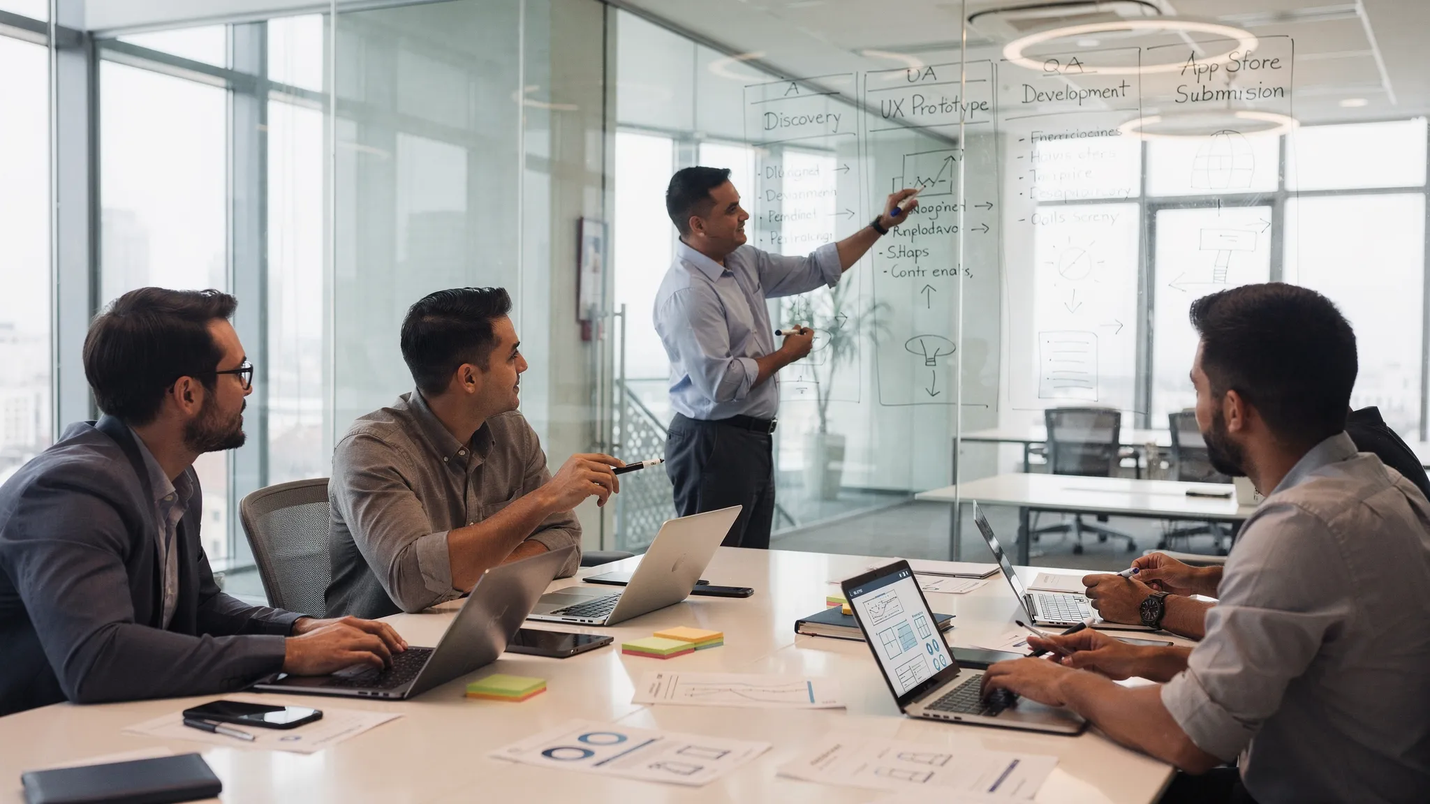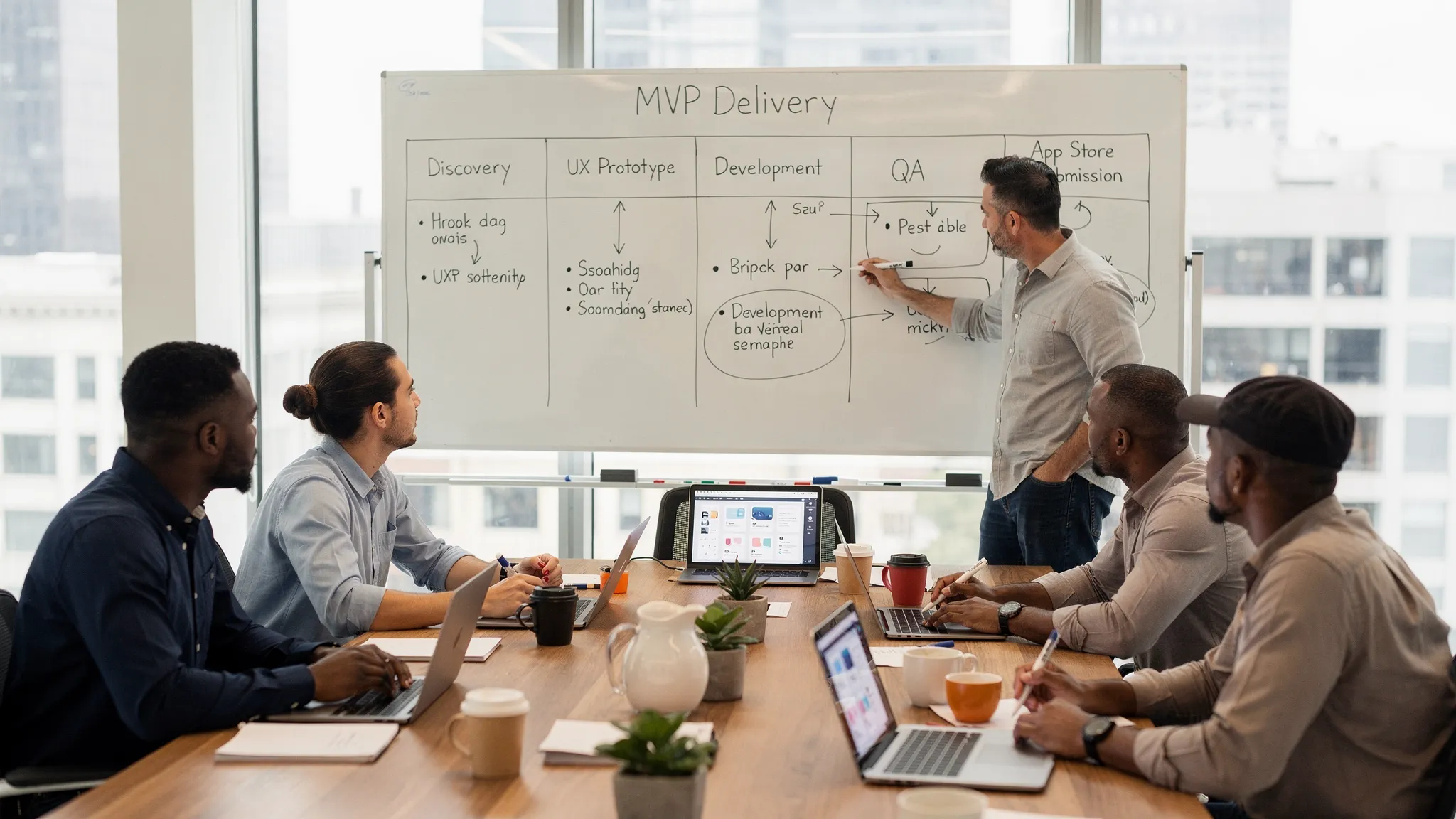 - Timeline with phases (discovery, UX, build, QA, store readiness)