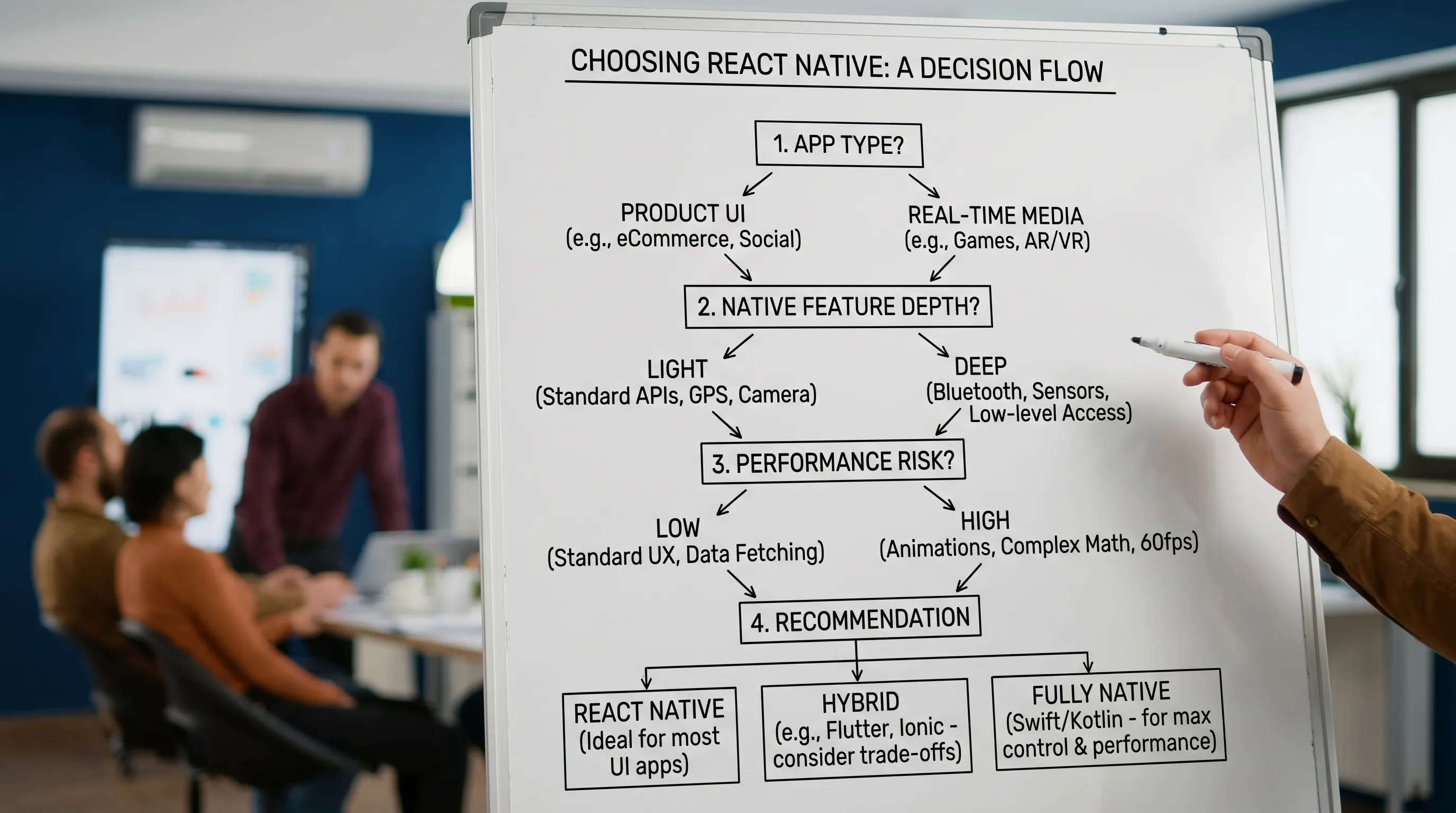 What types of apps should avoid React Native? Apps that depend on real-time media pipelines, advanced graphics, AR, or highly specialized background behavior often benefit from native or a hybrid architecture, because the performance ceiling and OS-level control are higher.